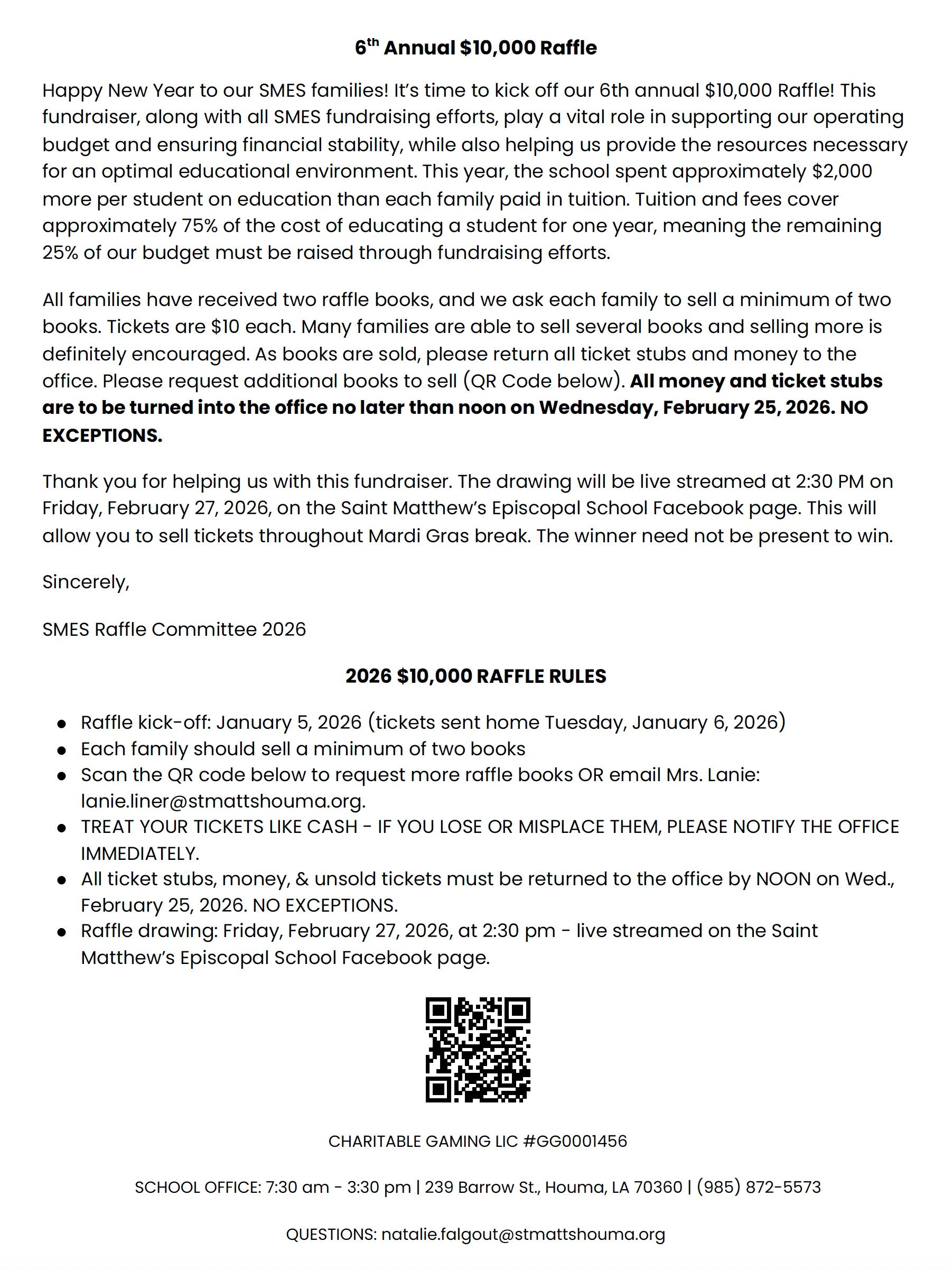 $10,000 Raffle to Benefit SMES! Each year, Saint Matthew's Episcopal School hosts a $10,000 Raffle!Tickets will be available through school families or the front office.